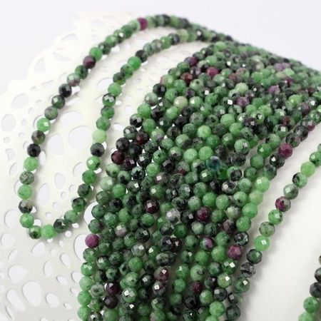 Fasetowane małe kule zoizytu z rubinem.