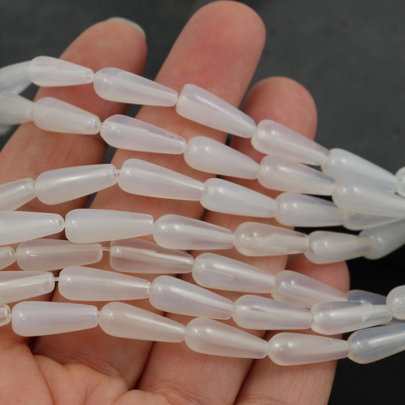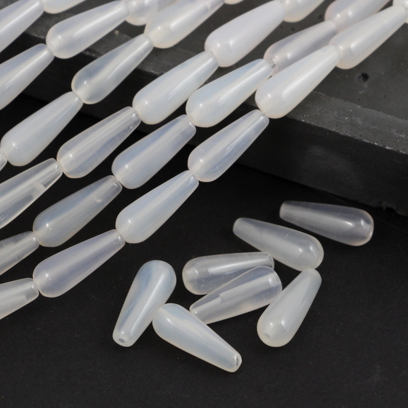 Smukłe krople białego agatu, nie są śnieżnobiałe, raczej z nutą szarości.
