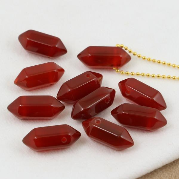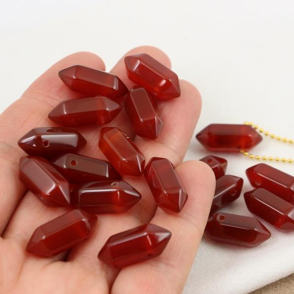 Agat karneolowy w postaci szlifowanych słupków, z obu stron zakończony szpicem. Kamienie wiercone przez wierzchołek wszerz, średnica otworu ok. 1,5-1,7mm co daje wiele możliwości montażu (sznurek, rzemień, drut a nawet drobny łańcuszek (na zdjęciach użyliśmy łańcuszka kulkowego 1,5mm).