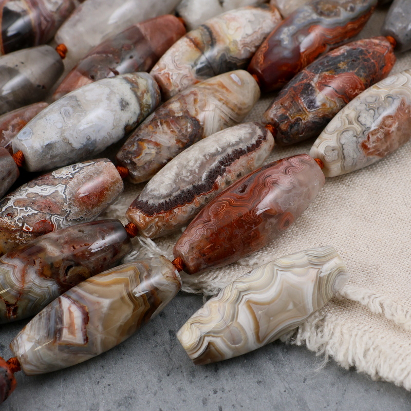 Długi oliwki agatu z pięknymi, dekoracyjnymi wzorami w kolorystyce szaro-beżowo-rdzawej.