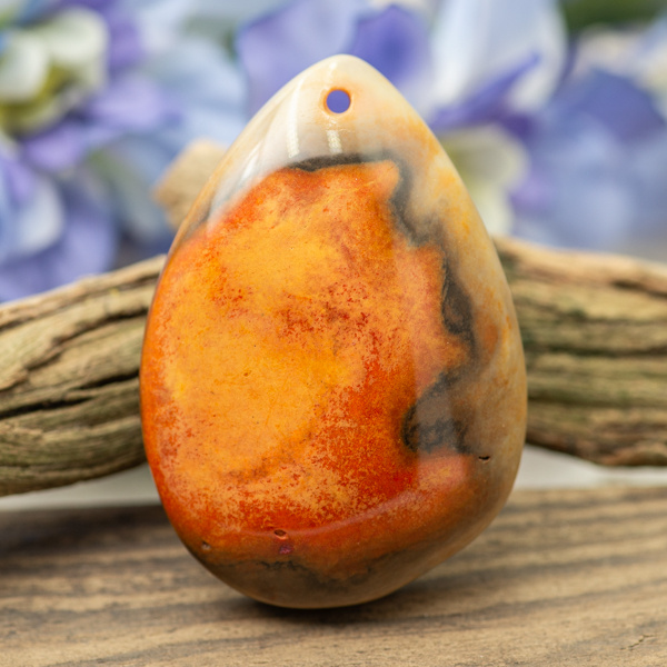 Kaboszon zawieszka agatu. Obustronnie polerowany z przewierconym otworem od frontu. Spód płaski. Może posiadać naturalne nierówności powierzchni.