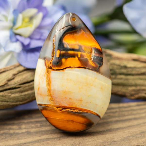 Kaboszon zawieszka agatu. Obustronnie polerowany z przewierconym otworem od frontu. Spód płaski. Może posiadać naturalne nierówności powierzchni.