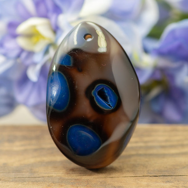 Zawieszka agatu. Obustronnie polerowana z przewierconym otworem od frontu. Spód płaski. Posiada naturalne nierówności powierzchni. Od frontu posiada naturalne zagłębienie (druza).