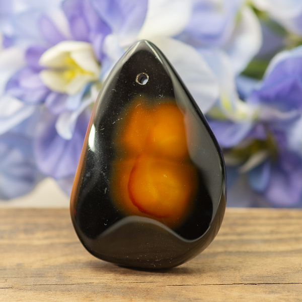 Zawieszka agatu. Obustronnie polerowana z przewierconym otworem od frontu. Spód płaski. Posiada naturalne wgłębienia i nierówności powierzchni.