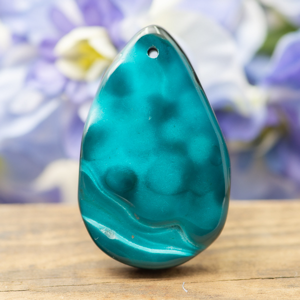 Zawieszka agatu. Obustronnie polerowana z przewierconym otworem od frontu. Spód płaski. Posiada naturalne nierówności powierzchni.