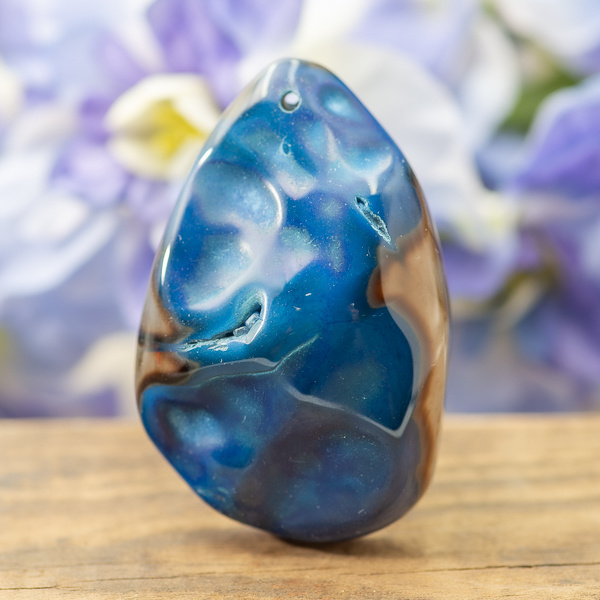 Zawieszka agatu. Obustronnie polerowana z przewierconym otworem od frontu. Spód płaski. Posiada naturalne wgłębienia, spękania i nierówności powierzchni.