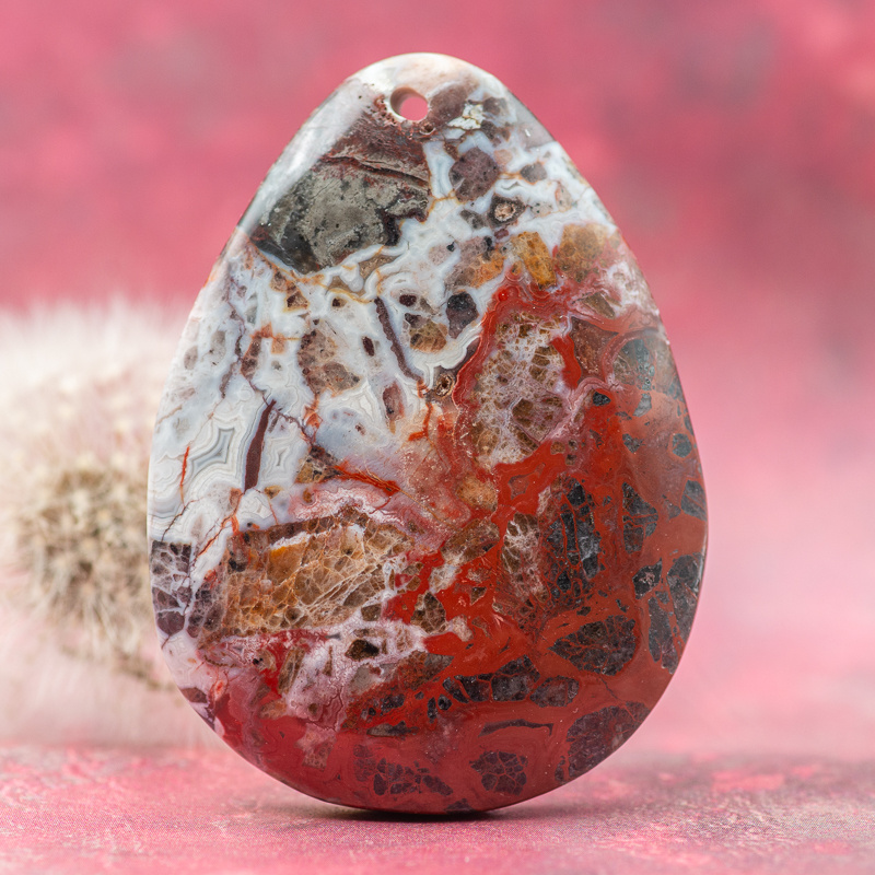 Zawieszka agatu meksykańskiego. Obustronnie polerowana z przewierconym otworem od frontu. Spód płaski.