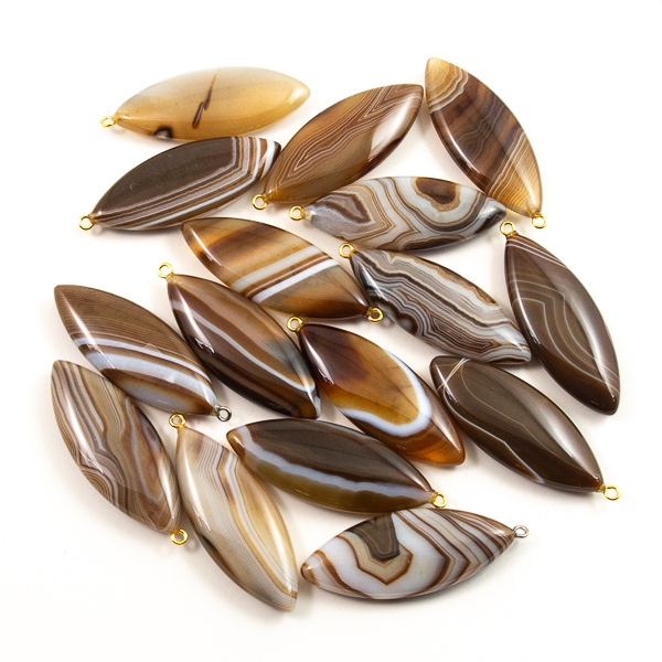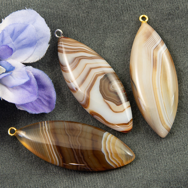 Zawieszka naturalnego agatu w kształcie wrzeciona z metalowym uszkiem pozwalającym na przewleczenie łańcuszka, rzemienia itp. Obustronnie polerowana.