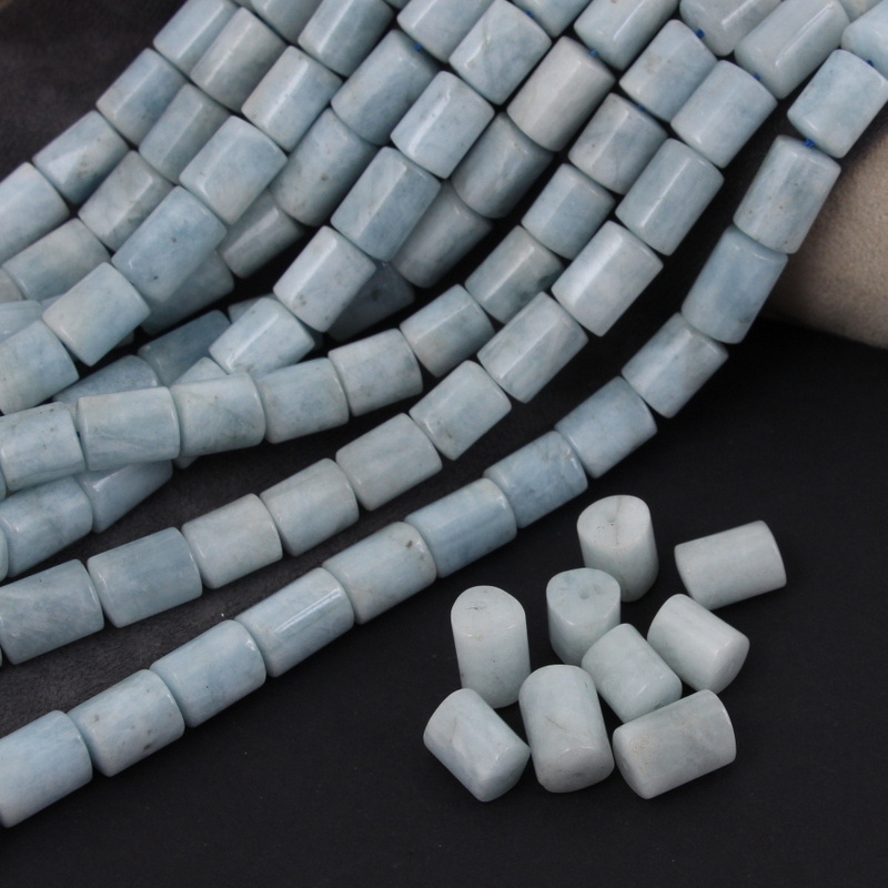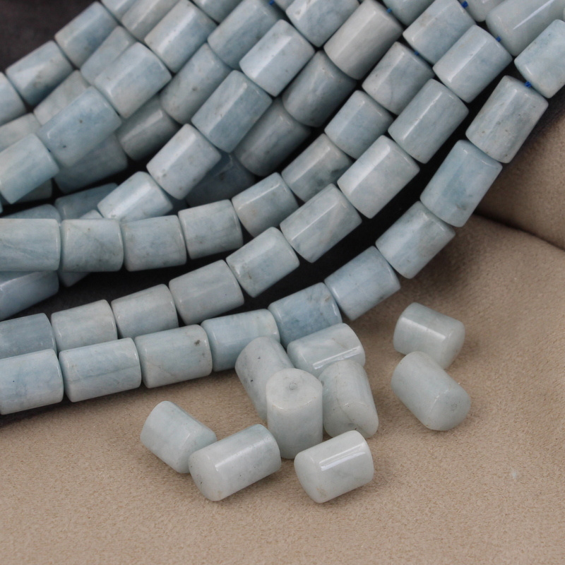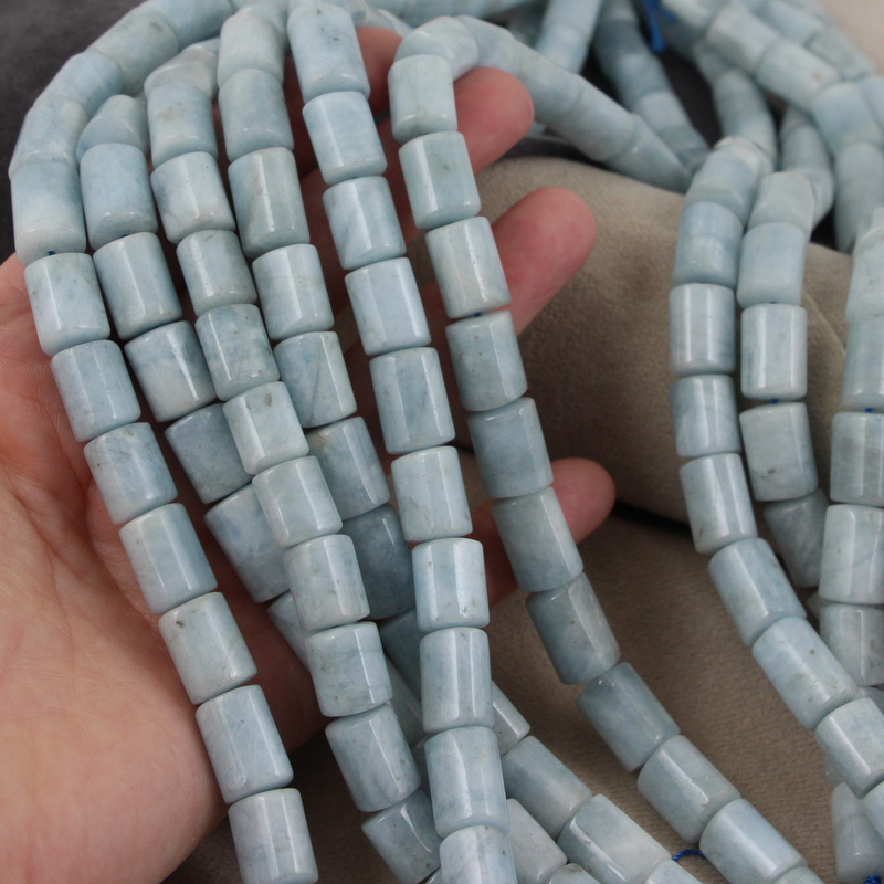 Gładkie wałeczki błękitnego akwamarynu. Wałki mają przekrój lekko trójkątny (mocno zaokraglony).
