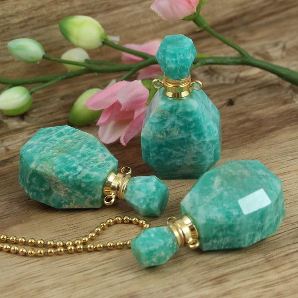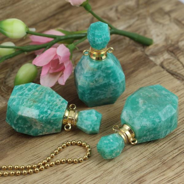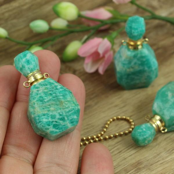 OpisFlakonik - szlifowana buteleczka z amazonitu. Sekretnik można zawiesić na łańcuszku. Flakonik można odkręcić i do środka włożyć drobną pamiątkę lub wlać niewielką ilość perfum (około 1-1,5ml).