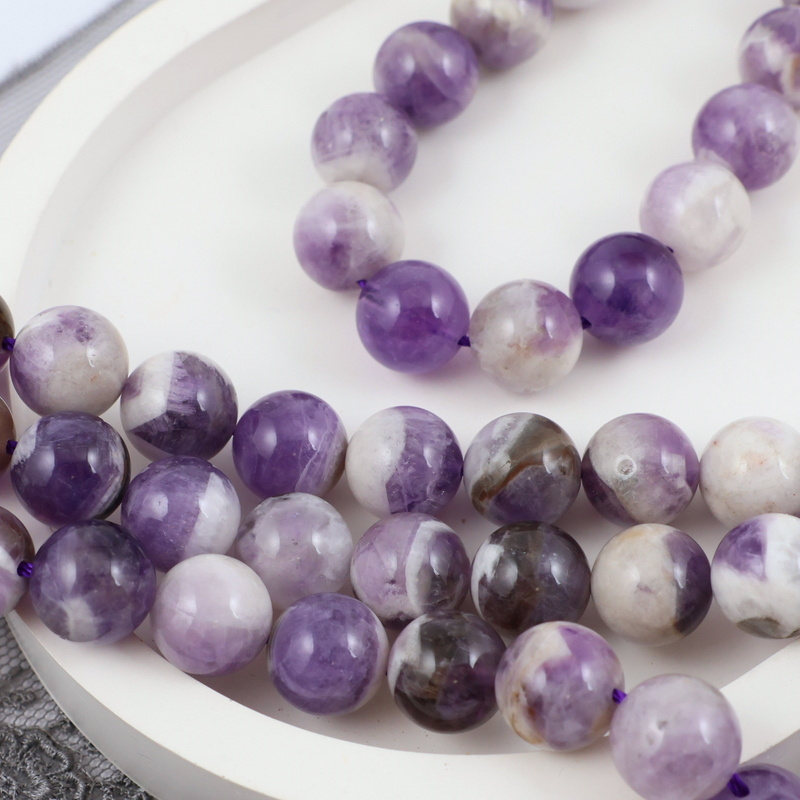 Kule ametystu w wersji fioletowo-białej (zdarzają się kule szarawe). Taka odmiana ametsytu nosi nazwę palisadowej (ametyst sage), jasne wtrącenia to biały kwarc.