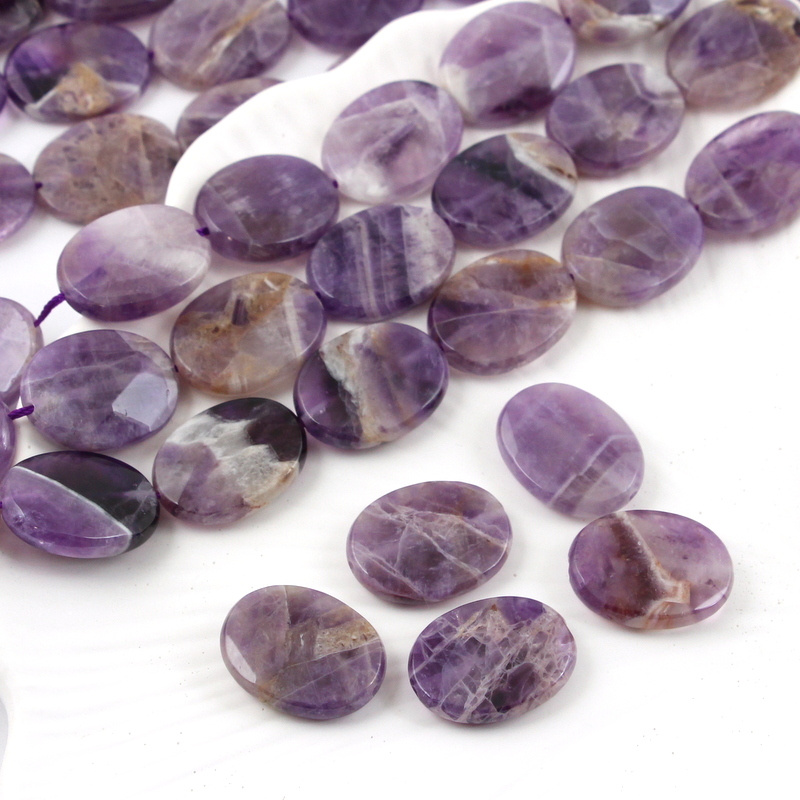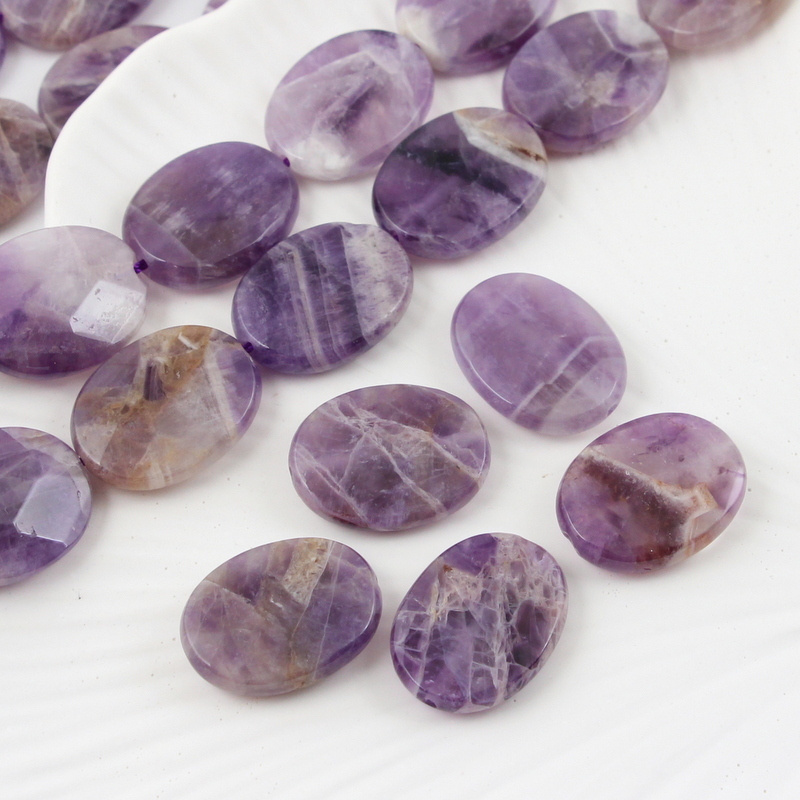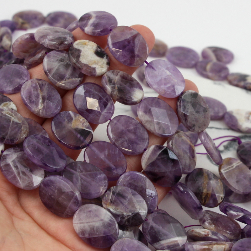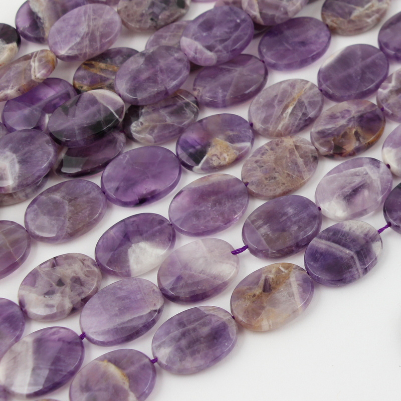 Ametyst chevron/szewron (warstwowy) to naturalny kamień o wyjątkowym wzorze łączącym pasma fioletowego ametystu z mlecznobiałym kwarcem.