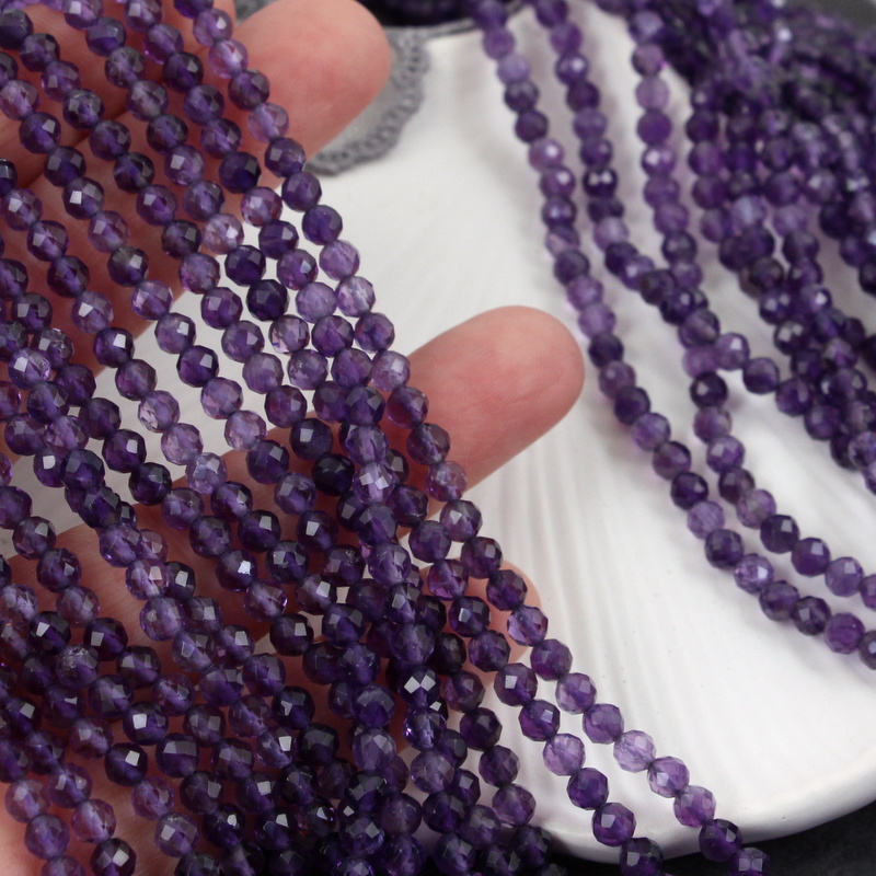 Fasetowane kuleczki ametystu w ciemnej tonacji.