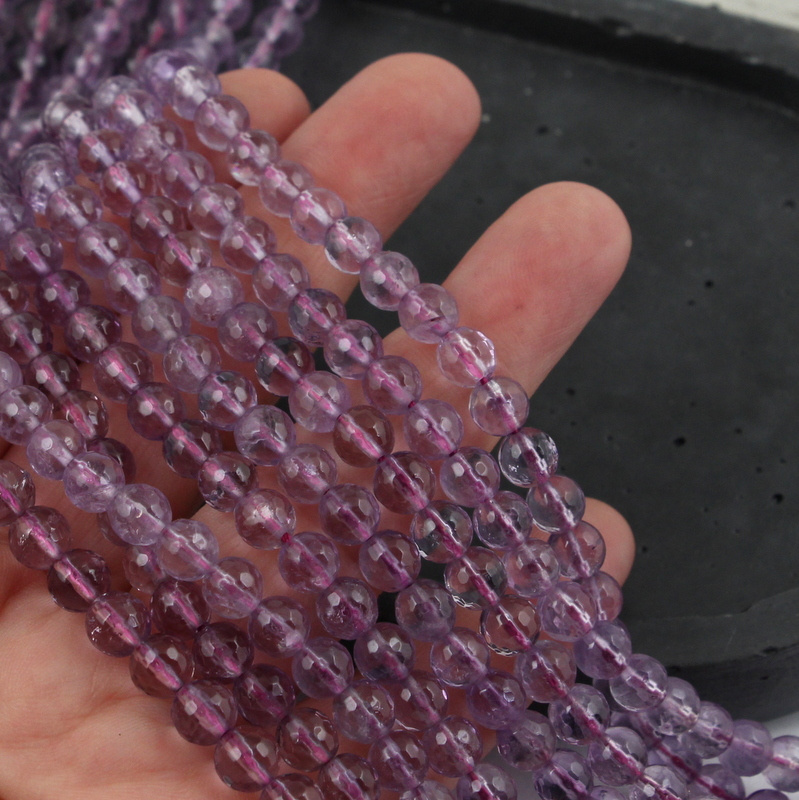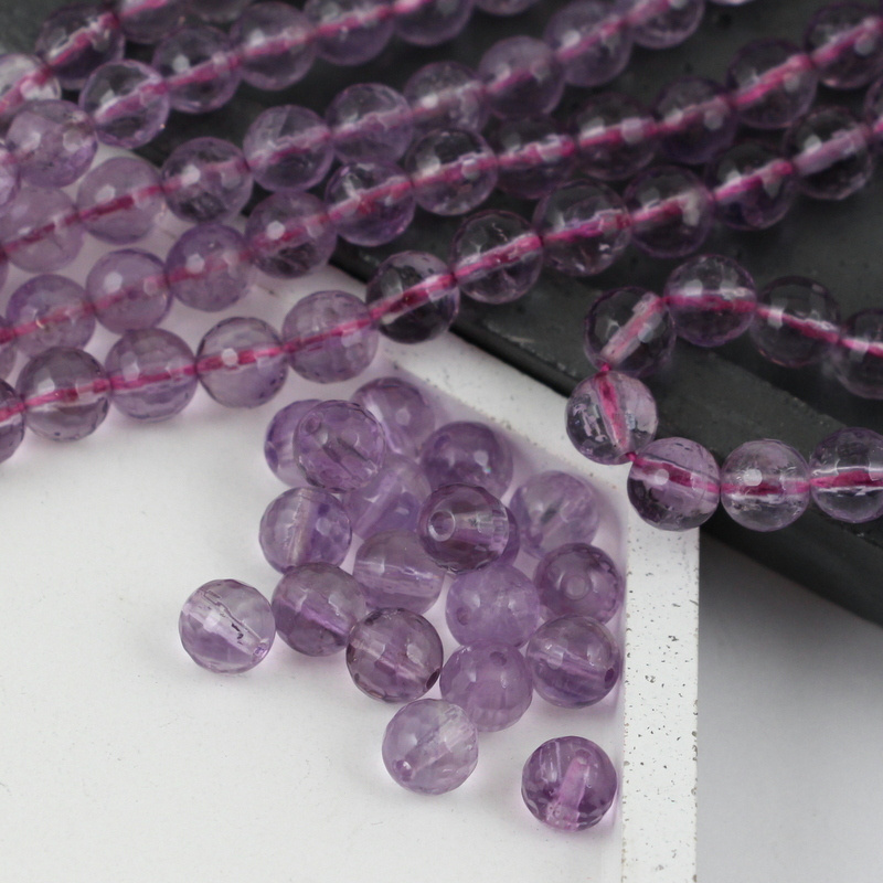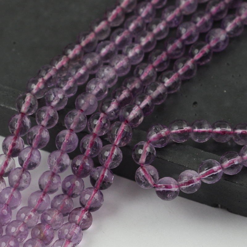 Fioletowe kuleczki dobrej jakości ametystu o ładnym, drobnym szlifie.