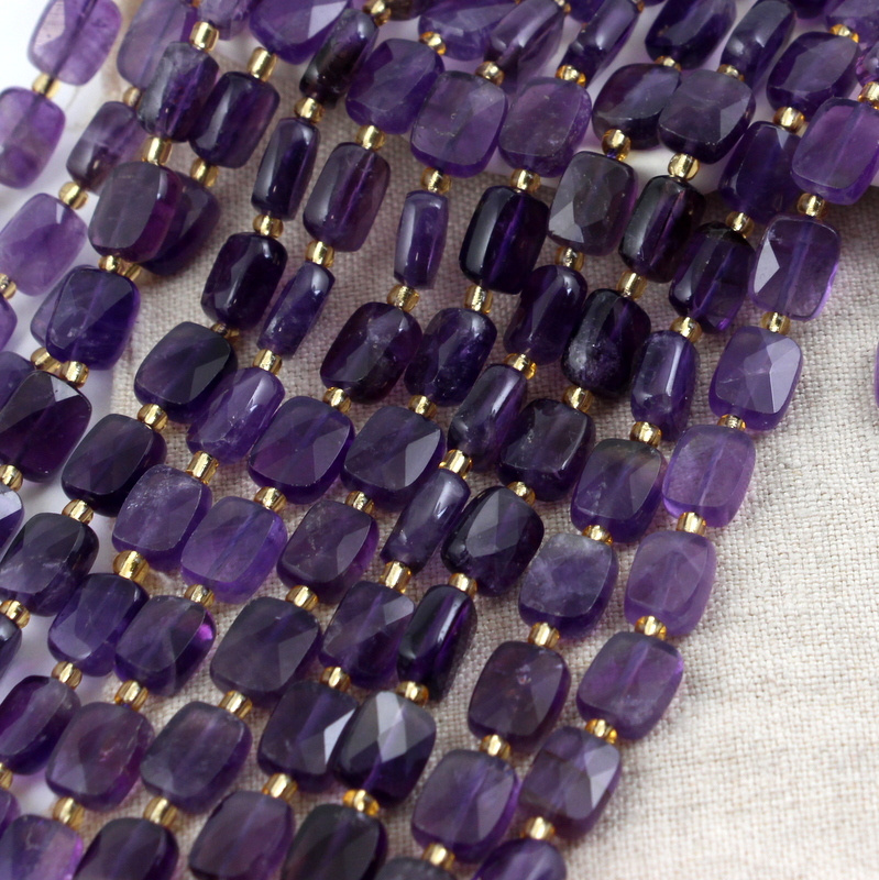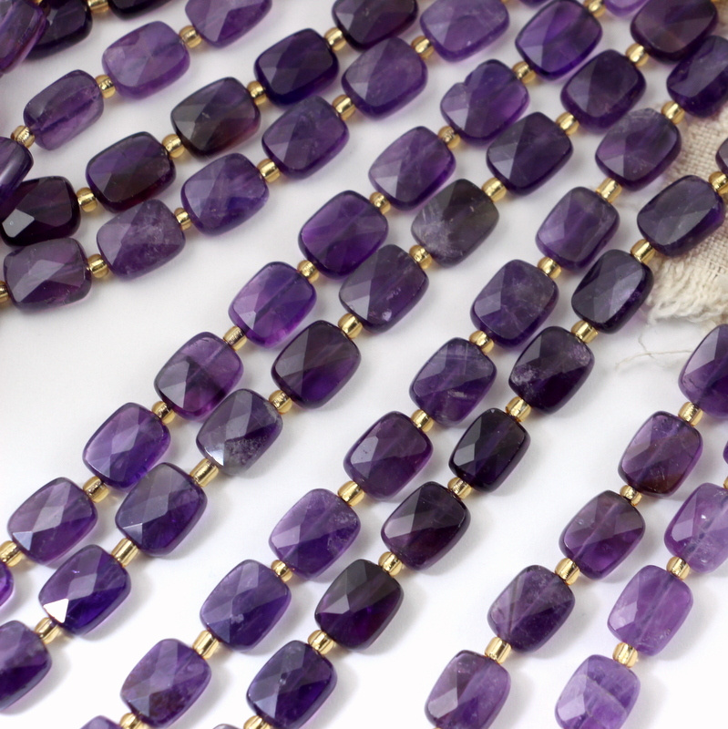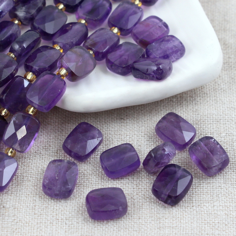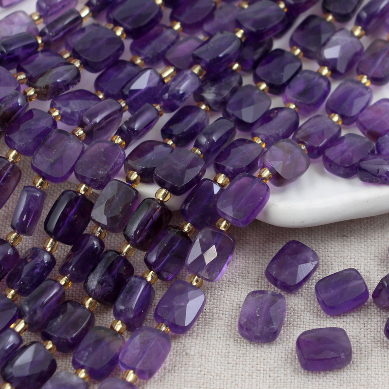 Naturalny ametyst o wymiarach 10x8 mm, oszlifowany w elegancki kształt prostokąta z fasetowaną powierzchnią.