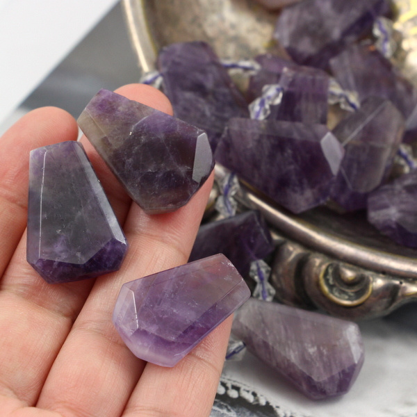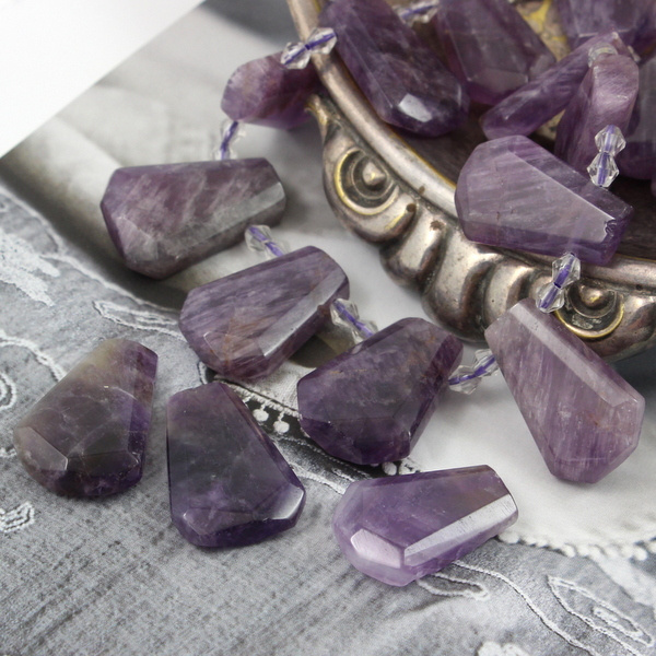 Ametyst w postaci fasetowanych trapezów (ramiona nie zawsze symetryczne). Na zawieszkę, element naszyjnika.