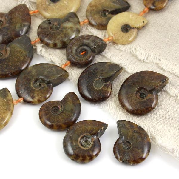 OpisMuszla, amonit, obustronnie szlifowany, gładki, wiercone przez długość.