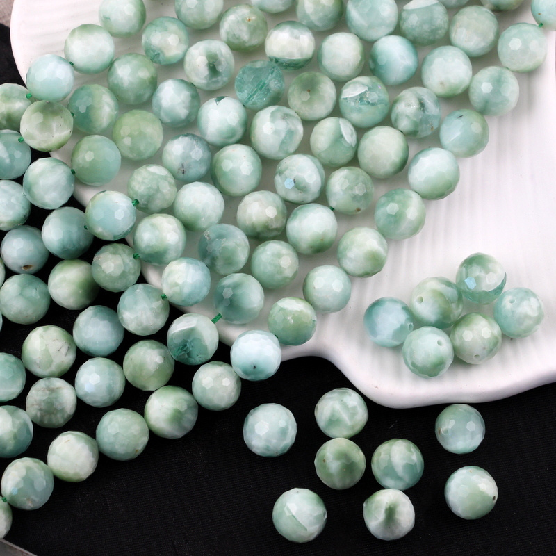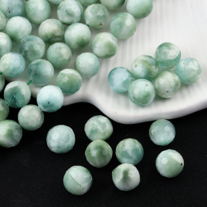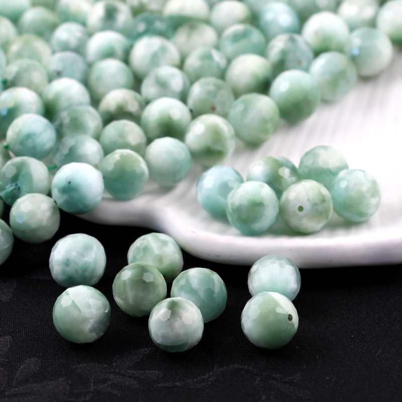 Piękne, fasetowane kule angelitu zielonego w oryginalnym kolorze miętowo-błekitnym i niezwykłej poświacie.