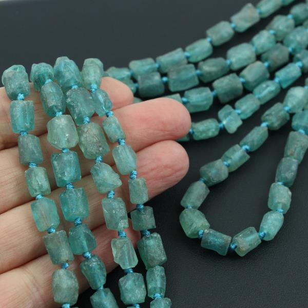 Surowe, nieregularne bryłki / wałki zielono-niebieskiego apatytu. Zakres rozmiarów: 8-10 x 6-9mm.