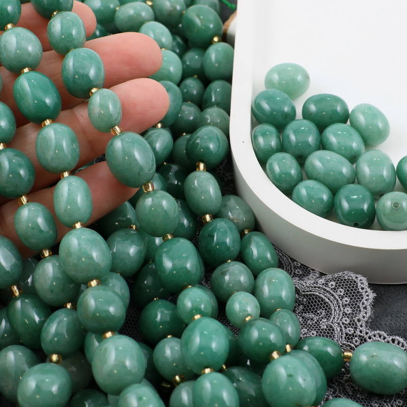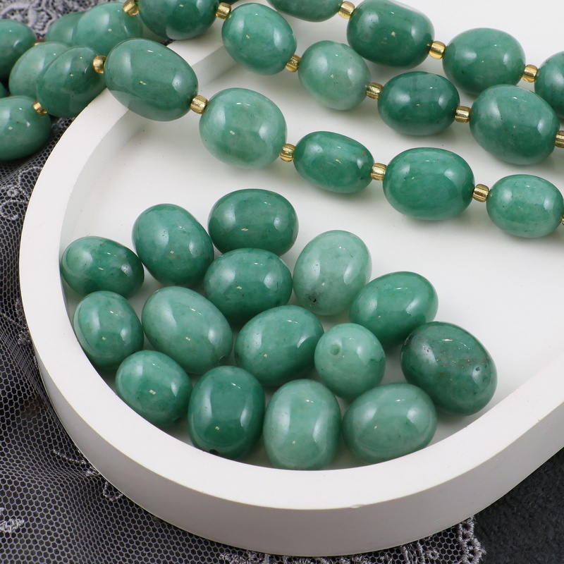 Gładkie beczułki / oliwki / jajka awenturynu zielonego. Kamienie o różnym nasyceniu zieleni, odcienie zieleni od jasnej do butelkowej.