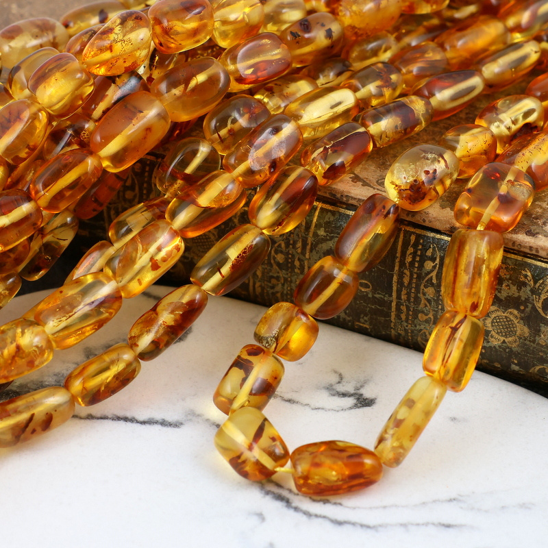 Sznur bursztynu bałtyckiego w kształcie prostokątnym, nieregularne, w przewadze żółte transparentne z wtrąceniami.