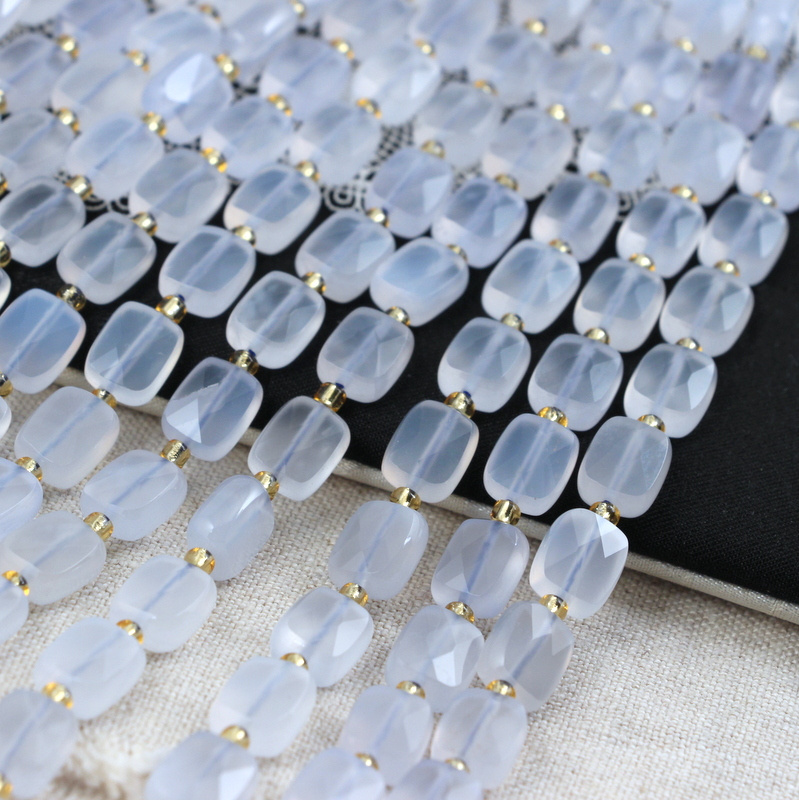 Fasetowanie nadaje mu subtelny połysk i sprawia, że kamień pięknie odbija światło, zachowując jednocześnie swoją charakterystyczną, spokojną estetykę. Chalcedon jest minerałem z grupy kwarców, cenionym za swoją jednolitą strukturę i łagodną kolorystykę.