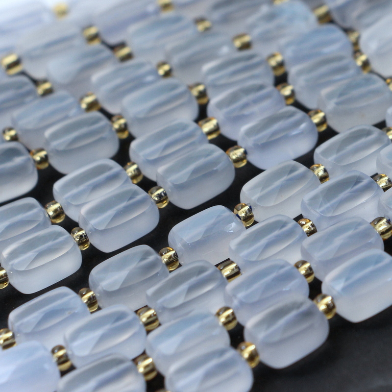 Naturalny chalcedon w eleganckim szlifie fasetowanym o wymiarach 10x8 mm i prostokątnym kształcie.