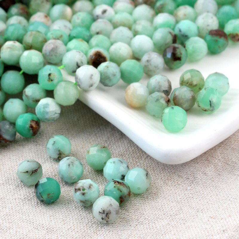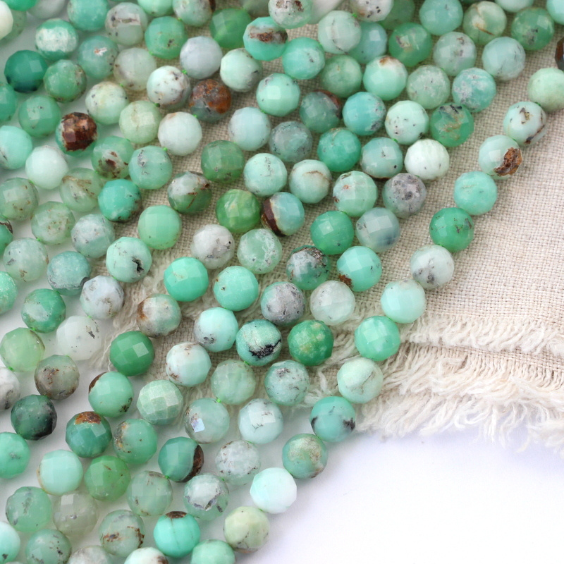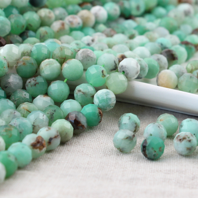 Fasetowane kule naturalnego chryzoprazu. Kamienie w odcieniu jasnej zieleni, przez miętową zieleń do zieleni leśnej, zdarzają się też bardzo jasne, prawie białe kule. Wtrącenia w kolorze białym, brązowym co jest typowe dla gatunku. Kamienie mogą mieć trochę zagłębień i nierówności co spowodowane jest tym, że chryzoprazy trudno się szlifuje.