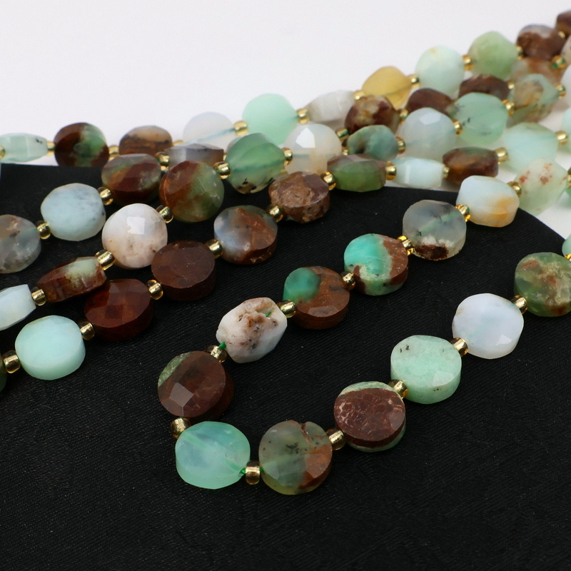 Chryzopraz to niezwykła odmiana chalcedonu o naturalnej, pastelowo-zielonej barwie. W tej odsłonie kamienie mają nieregularne wzory i przejścia kolorów – od miętowego i seledynowego po ciepłe brązy, miód i biel. Każdy element jest inny, tworząc niepowtarzalną mozaikę barw natury.