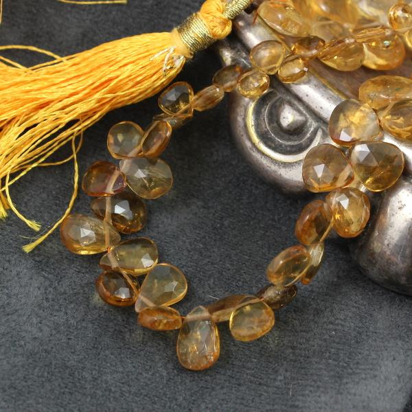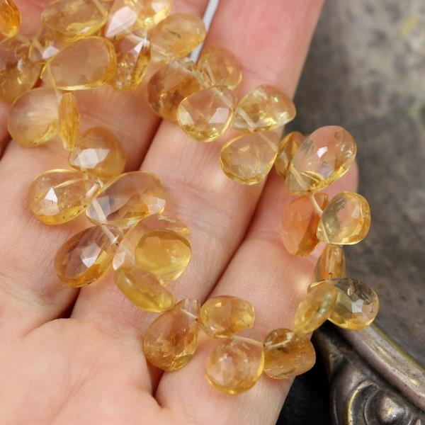 Fasetowane łezki cytrynu w odcieniu bursztynowym. Kamienie mają wtrącenia, wierzchołki mogą mieć niewielkie nierówności.