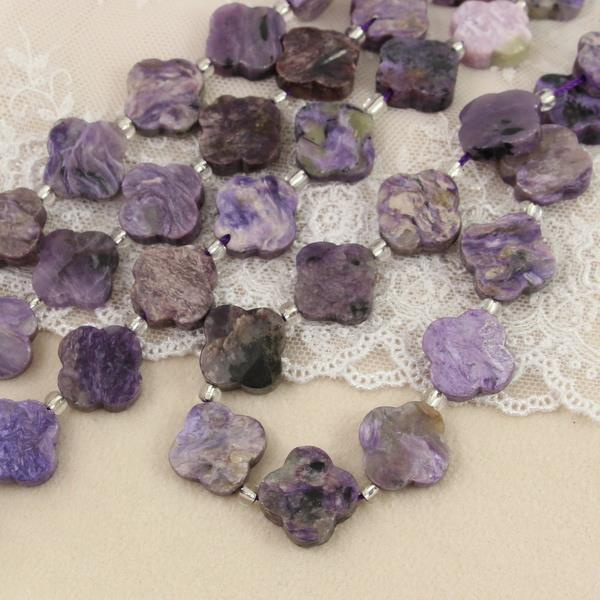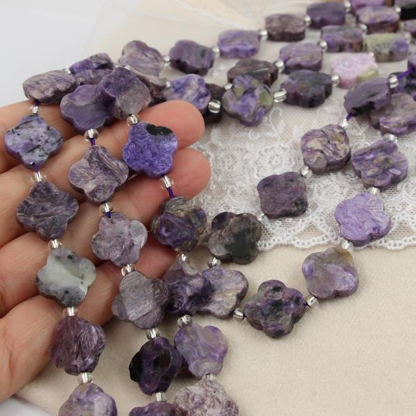 OpisNaturalny, rzadki kamień - czaroit w postaci kwiatków-koniczynek, płaskie kamienie w kolorach fioletowym, liliowo-różowym i czarnym i zielonkawym. Kamienie mają różną grubośći, na powierzchni zdarzają się niewielkie nierówności.