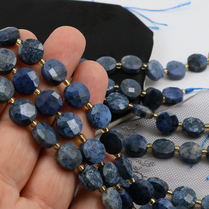 Dumortieryt – pastylki/monetki fasetowane. Dumortieryt to rzadki minerał o pięknej, niebiesko-granatowej barwie z subtelnymi odcieniami szarości, błękitu i atramentowych plamek. Jego struktura często przypomina akwarelowe przejścia barw, dzięki czemu każdy kamień jest niepowtarzalny.