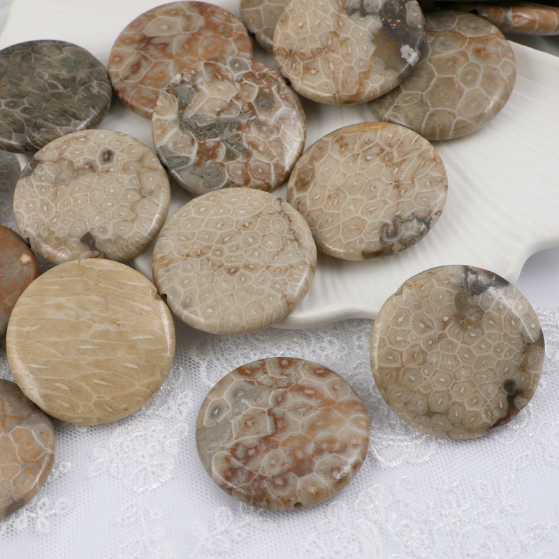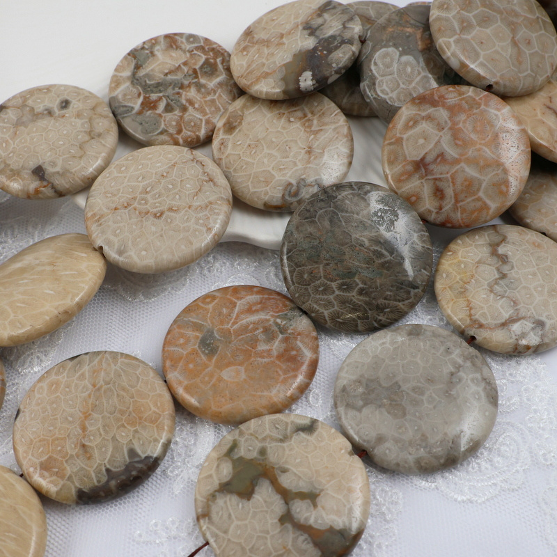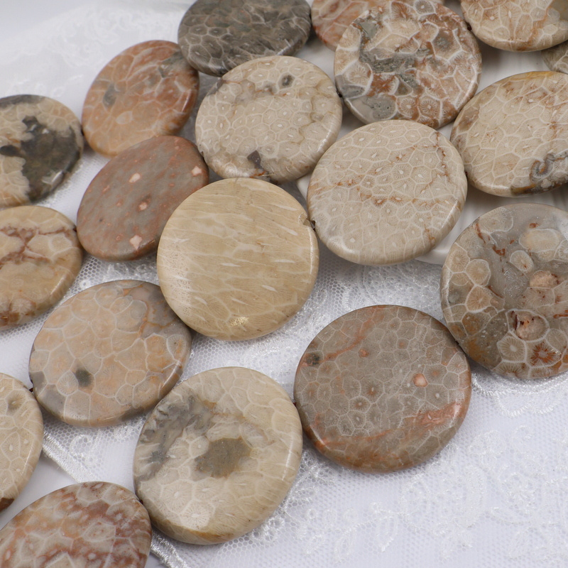 Okazałe monety fossilu z pięknymi, dekoracyjnymi wzorami w kolorystyce szaro-beżowo-brązowej.
