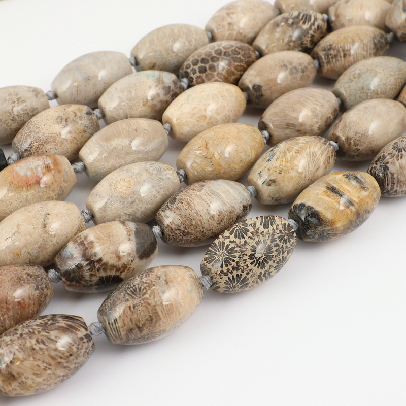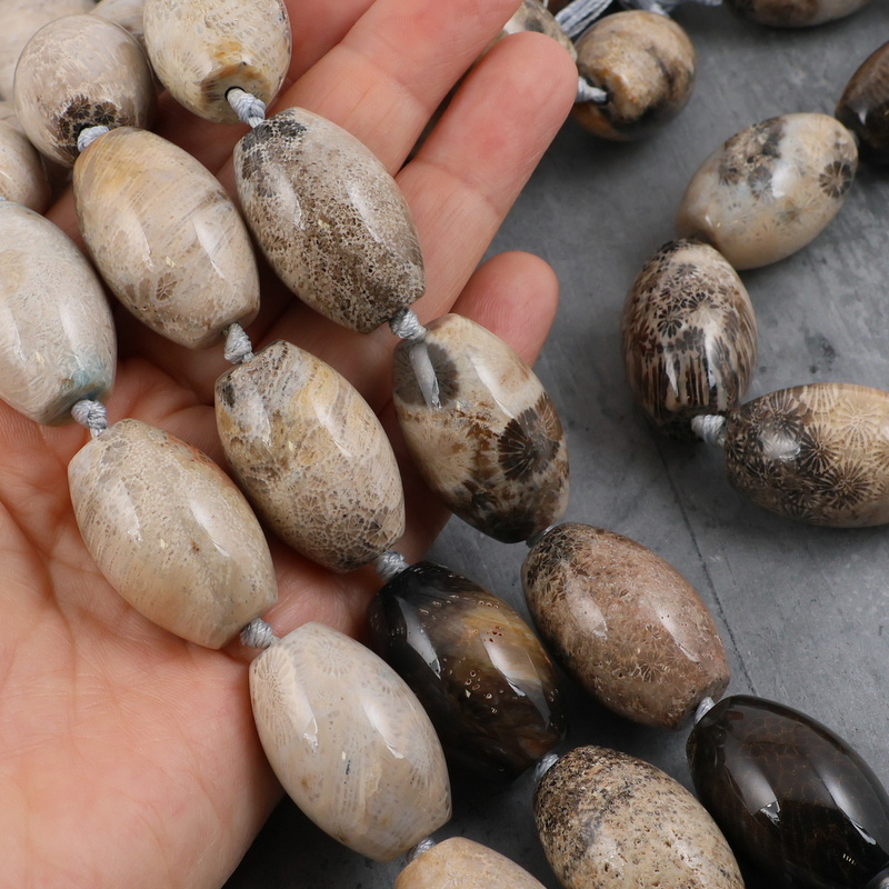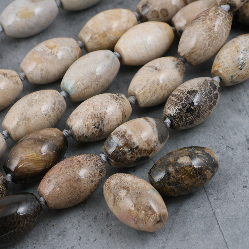 Okazałe oliwki fossilu z pięknymi, dekoracyjnymi wzorami w kolorystyce szaro-beżowo-brązowej.