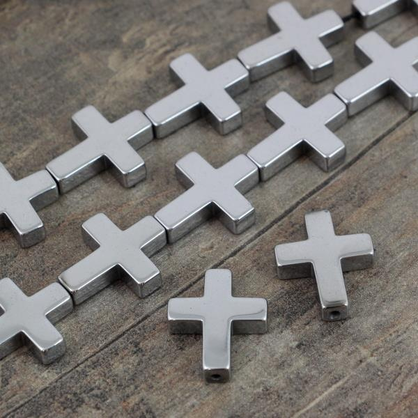 Gładki krzyż z hematytu w kolorze srebrnym.