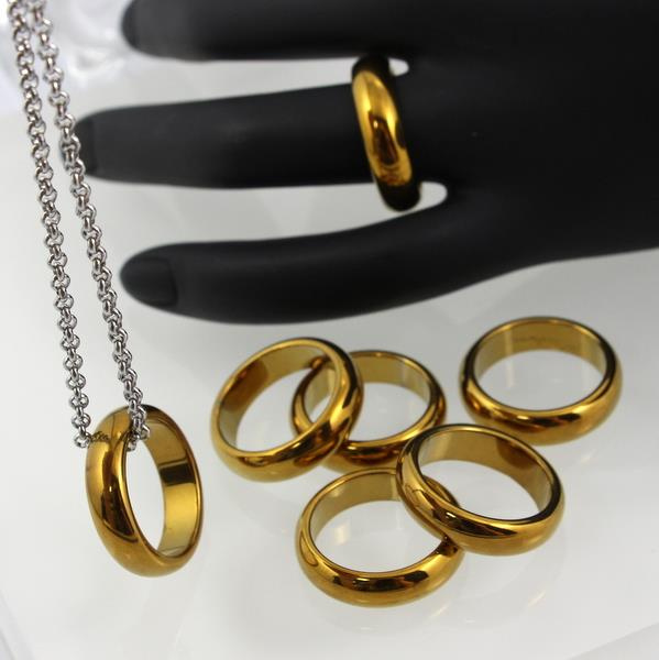 OpisHematyt - obrączka / ring w kolorze złotym. Może być użyta klasycznie jako obrączka na palec lub jako zawieszka do łańcuszka. Rozmiar: *- wewnętrzny (na palec) - 16,6-17,1mm* - szerokość 6mm