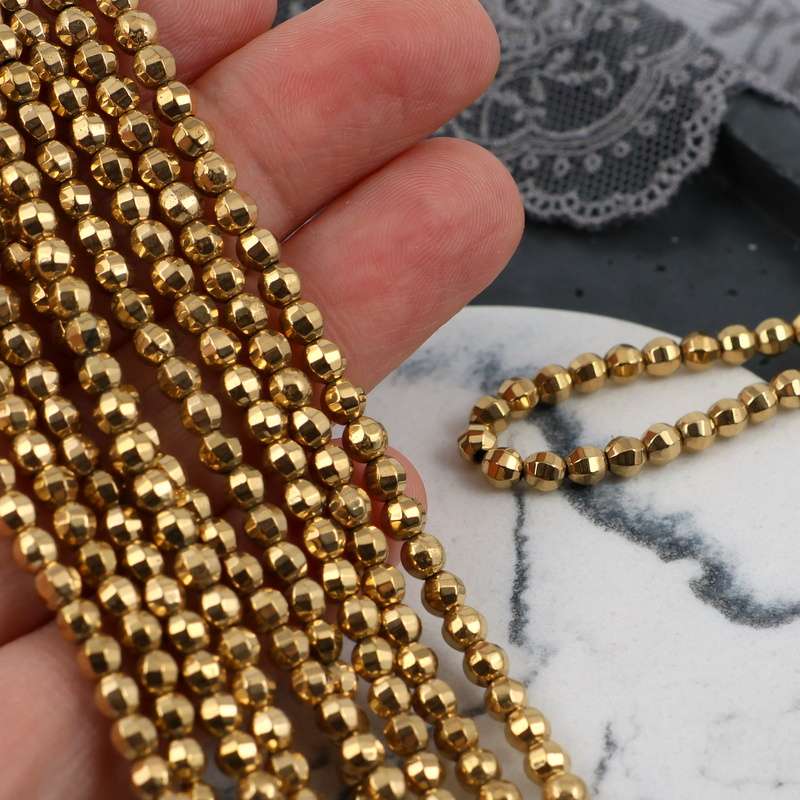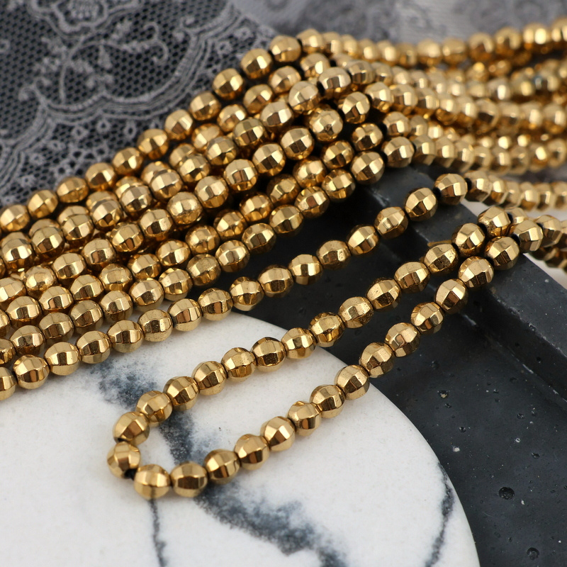 Złoty, fasetowany hematyt w kształcie zbliżonym kulek ze szlifem beczułkowatym.