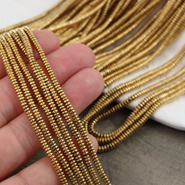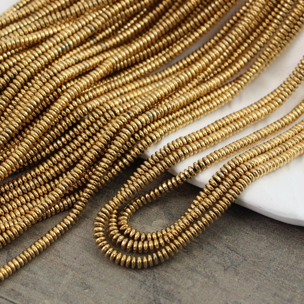 Złoty hematyt w kształcie gładkiej oponki. Idealnie sprawdzi się jako przekładka do drobnych kamieni.