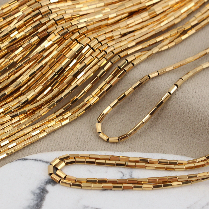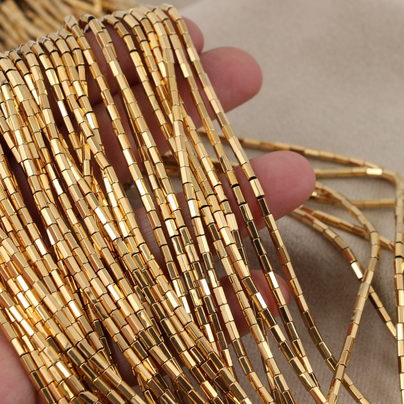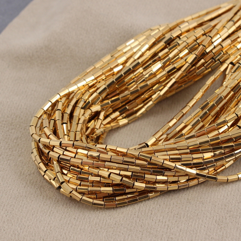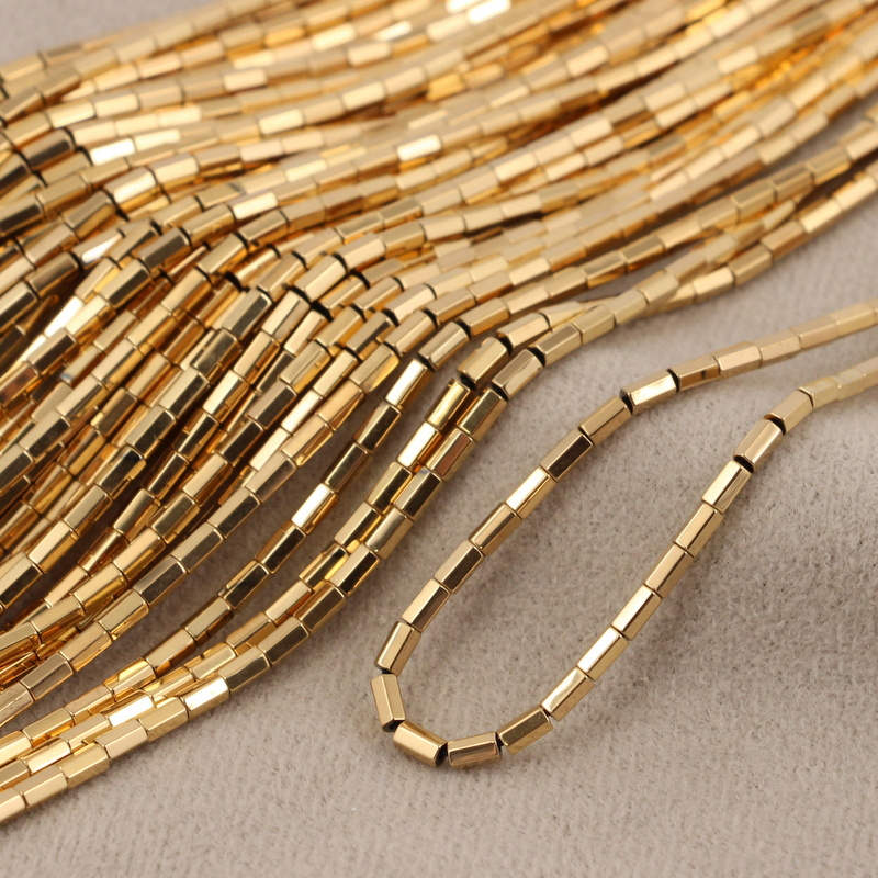 Złoty hematyt w kształcie wałka, rozmiar około 4x2mm.