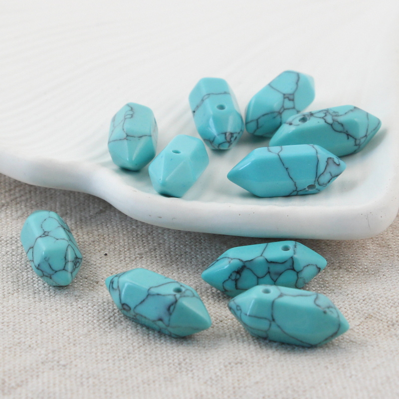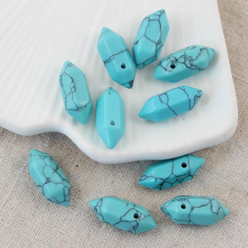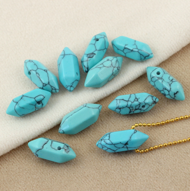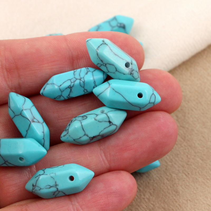 Howlit turkusowy w postaci szlifowanych słupków, z obu stron zakończone szpicem. Kamienie wiercone przez wierzchołek wszerz, średnica otworu ok. 1,5-1,7mm co daje wiele możliwości montażu (sznurek, rzemień, drut a nawet drobny łańcuszek (na zdjęciach użyliśmy łańcuszka kulkowego 1,5mm).