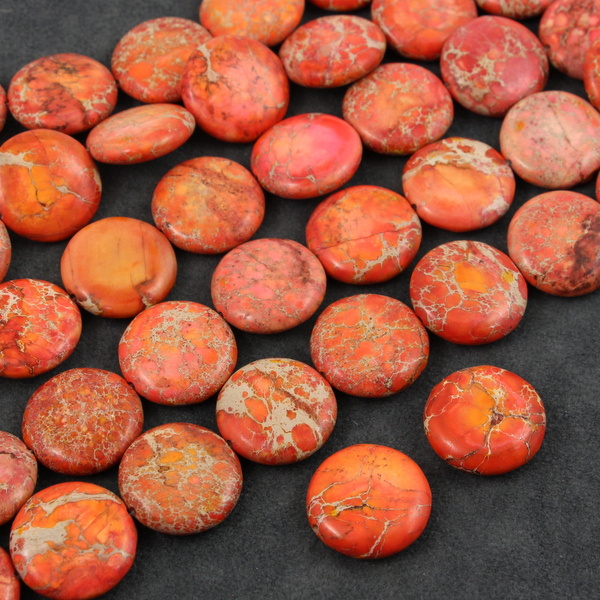 Wzorzyste monetki jaspisu w kolorze pomarańczowym. Polecamy do sutaszu i klasycznych projektów.