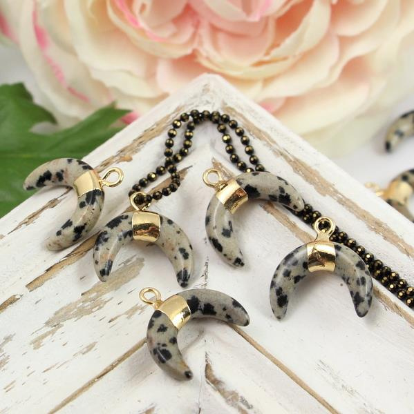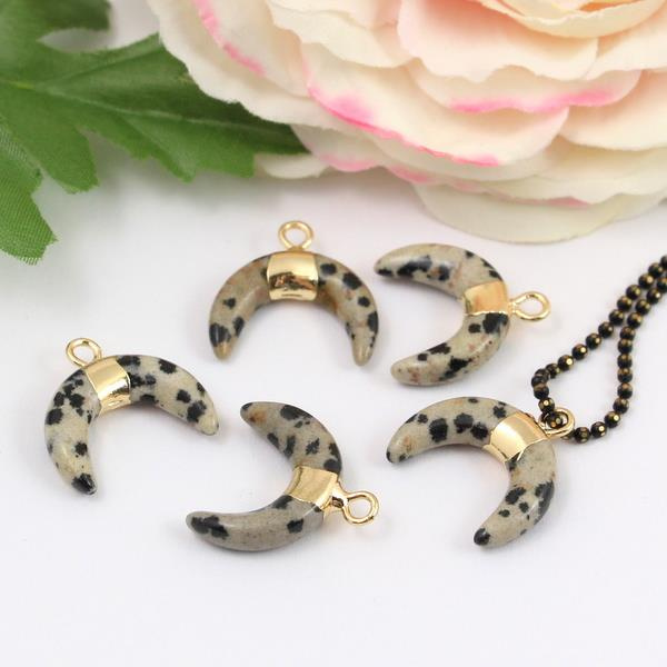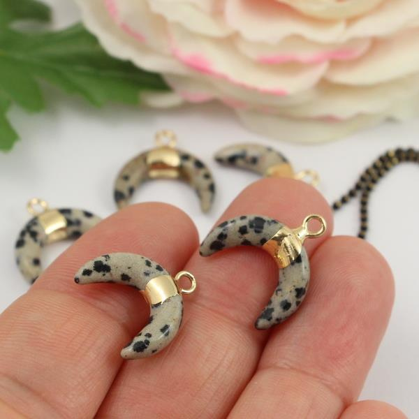 OpisZawieszki w kształcie księżyca / rogu z jaspisu dalmatyńskiego z kółeczkiem do montażu.