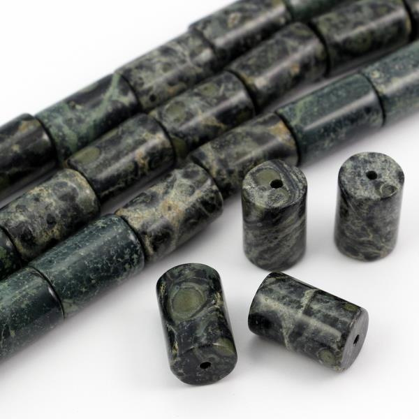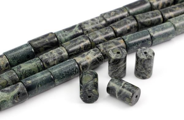 Jaspis kambaba w kształcie wałków. Kamienie mają odcień zieleni leśnej, pasują do stylizacji moro. Czym jest