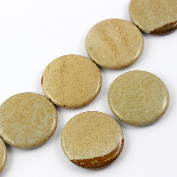 OpisDuże monety jaspisu krajobrazowego (inaczej jaspis obrazkowy). Kamienie w tonacji piaskowej bez motywów krajobrazowych lub z niewielkim fragmentem.