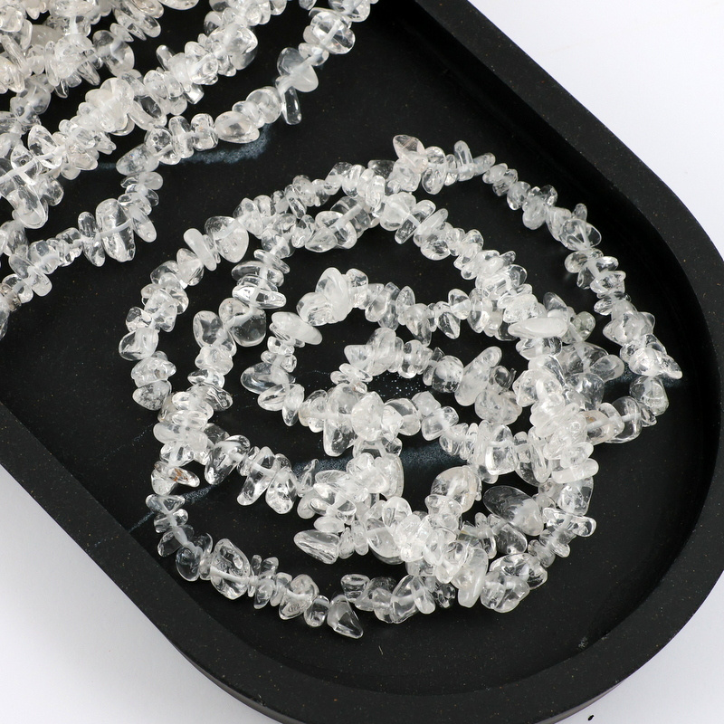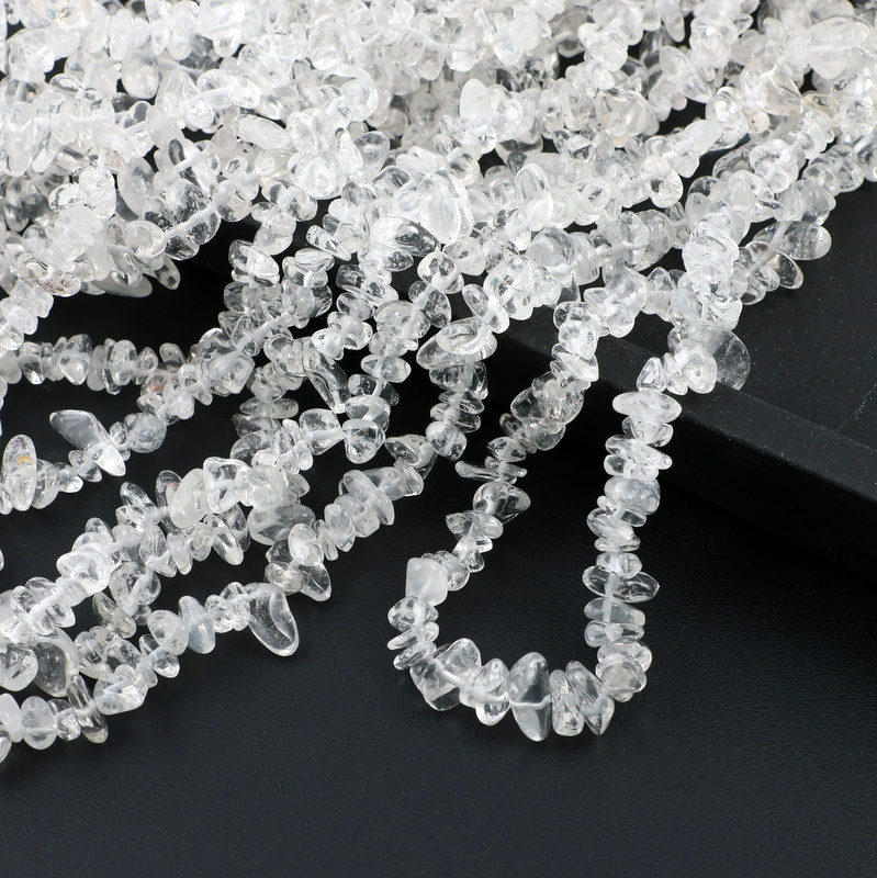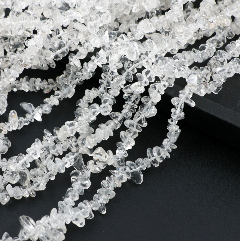 Kryształ górski w formie sieczki. Koraliki mają nieregularny, naturalny kształt, przypominający drobne bryłki lub sieczkę. Powierzchnia jest gładka.