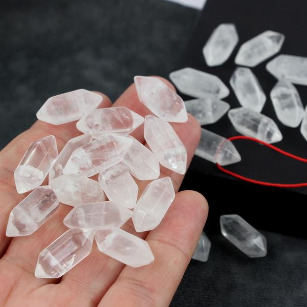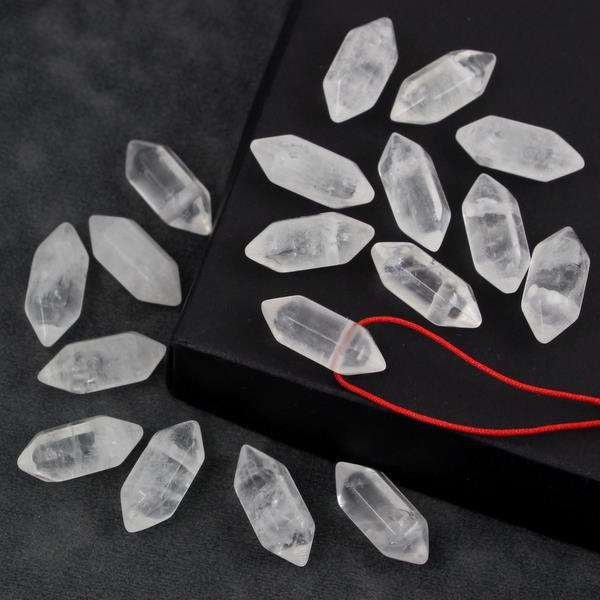Kryształ górski w postaci szlifowanych słupków, z obu stron zakończone szpicem. Kamienie wiercone przez wierzchołek wszerz, średnica otworu ok. 1,5-1,7mm co daje wiele możliwości montażu (sznurek, rzemień, drut a nawet drobny łańcuszek (na zdjęciach użyliśmy łańcuszka kulkowego 1,5mm).
