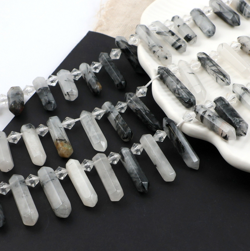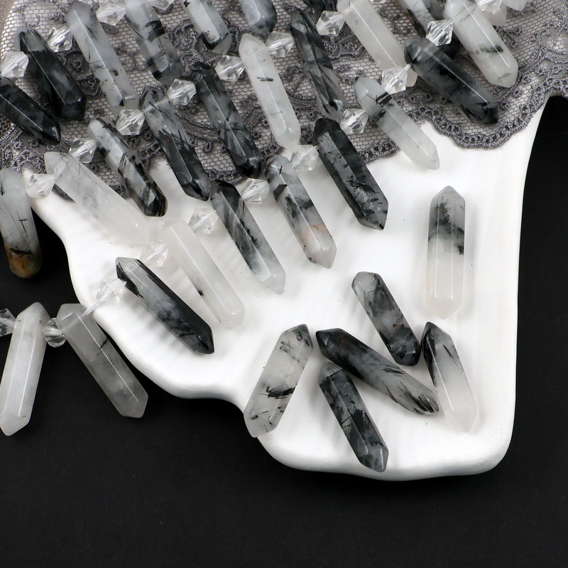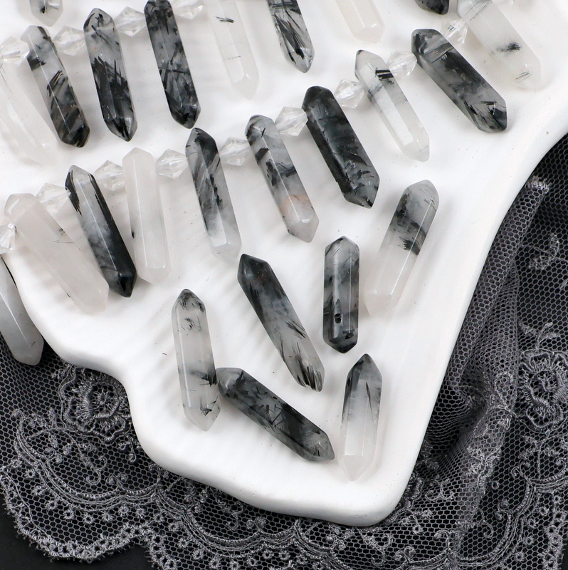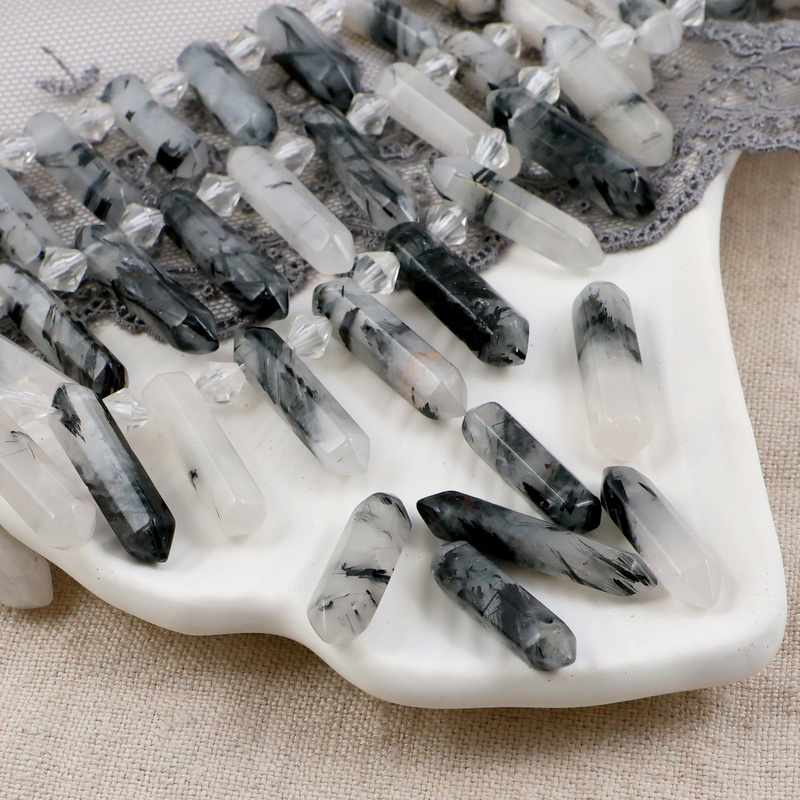 Kwarc w postaci szlifowanych słupków z widocznymi inkluzjami turmalinowych igiełek.