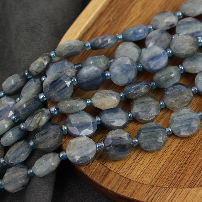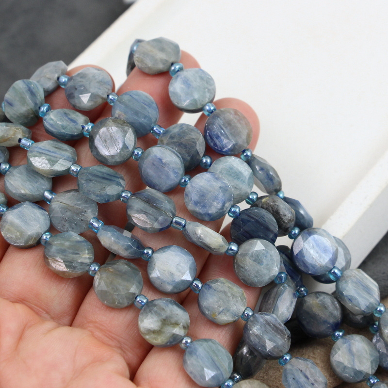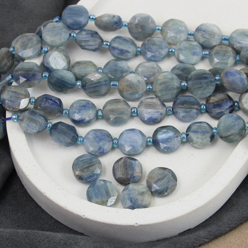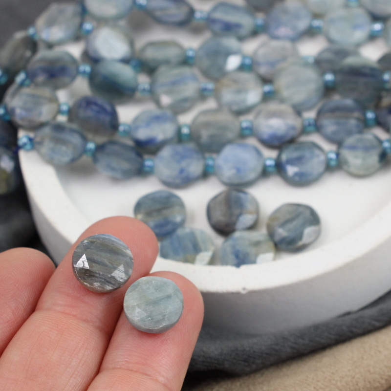 Fasetowane monetki kianitu/kyanitu, naturalny kolor niebiesko-szary.
