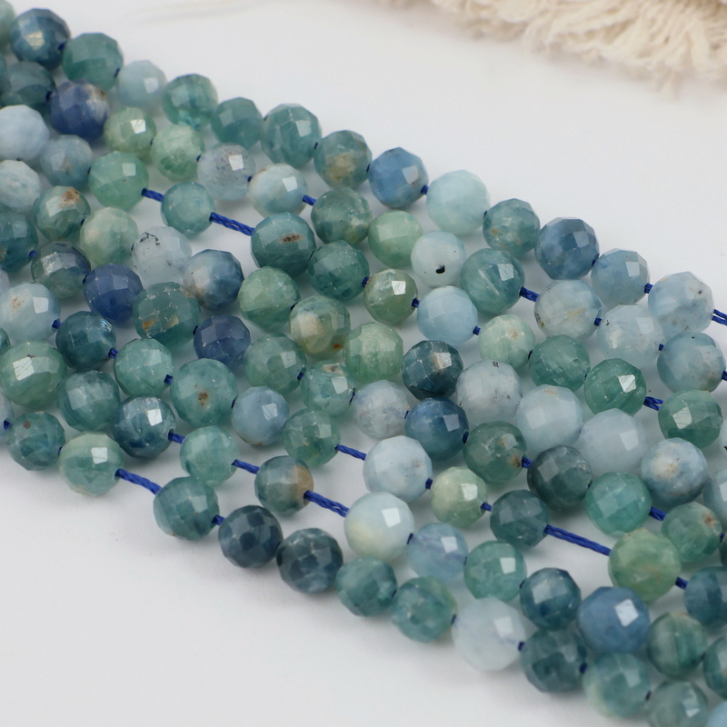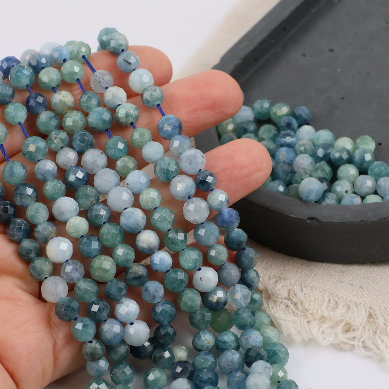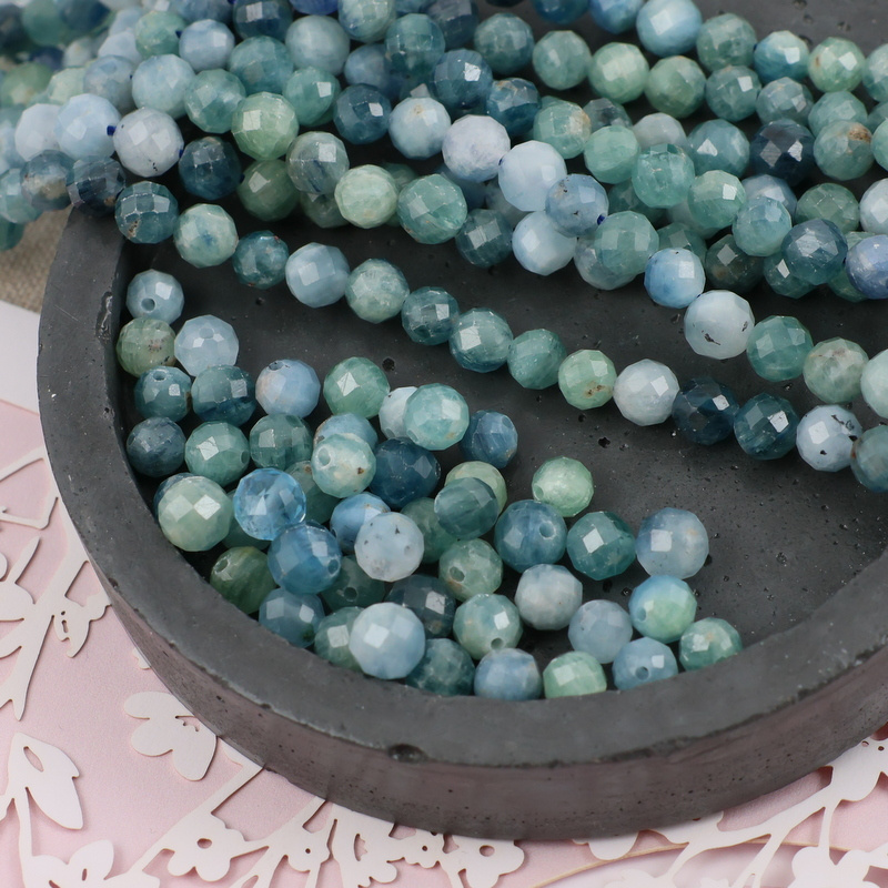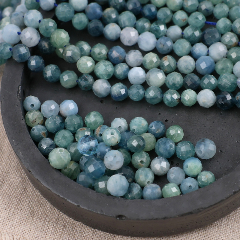 Fasetowane kulki z naturalnego kyanitu zielonego w odcieniach morskiej zieleni, błękitu i turkusu.