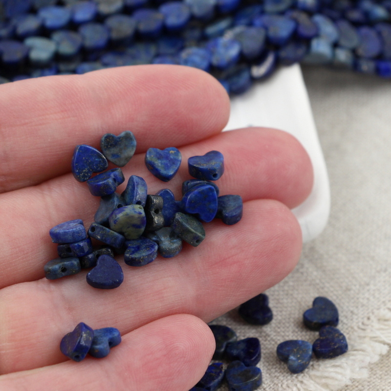 Drobne, gładkie serduszka lapisu lazuli z pirytem. Kamienie w odcieniach od niebieskiego przez granatowy.